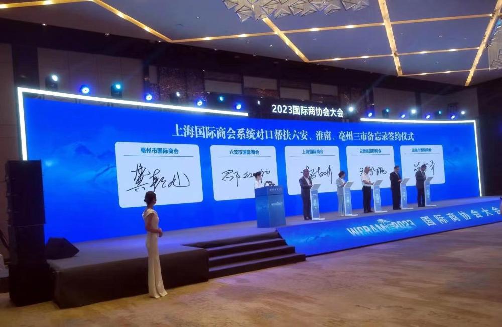 9月7日,2023 国际商协会大会在合肥召开,省长王清宪、中国贸促会副会长张少刚出席会议并致辞,来自境内外的多位商协会负责人到会发表演讲。会上上海市贸促会、安徽省贸促会、六安市贸促会、淮南市贸促会、亳州市贸促会签署了上海贸促系统对口帮扶皖北三市(六安、淮南、亳州)备忘录。