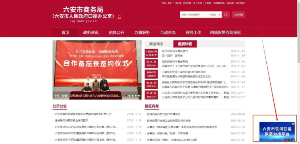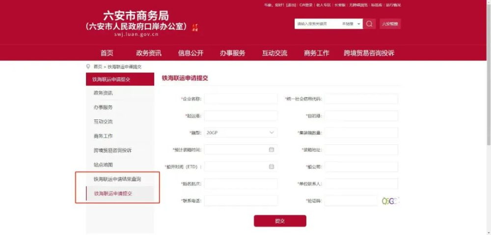 平台使用时,企业访问六安市商务局网站(https://swj.luan.gov.cn/),点击界面右下角飘窗内的文字进入,或者通过“跨境贸易咨询投诉”栏目进入,可以随时随地提交铁海联运的物流需求,并根据平台反馈的唯一查询码及时查询货代公司的受理情况。